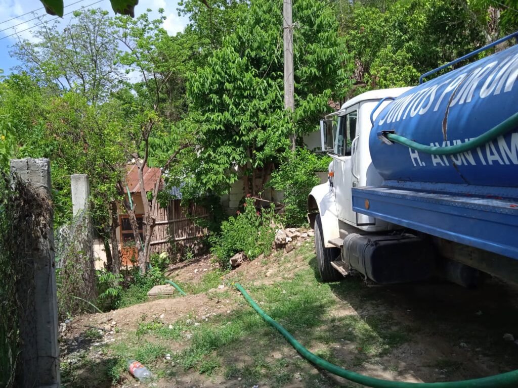 El gobierno municipal que encabeza el alcalde, ingeniero Jesús Guzmán Avilés, con atención a peticiones ciudadanas que requieren agua en sus hogares ante la falta de suministro en sus tomas domiciliarias.