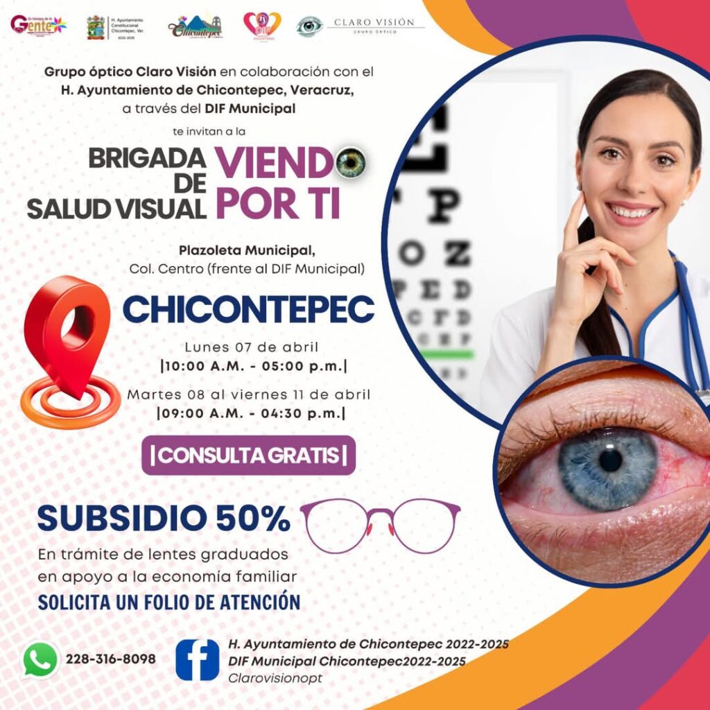 Grupo Óptico Claro Visión en coordinación con H. Ayuntamiento de Chicontepec 2022-2025 a través del DIF Municipal Chicontepec 2022 – 2025, invitan al 𝑷𝑼𝑩𝑳𝑰𝑪𝑶 𝑬𝑵 𝑮𝑬𝑵𝑬𝑹𝑨𝑳 a que asistan a la BRIGADA DE SALUD VISUAL que se estará realizando el día: